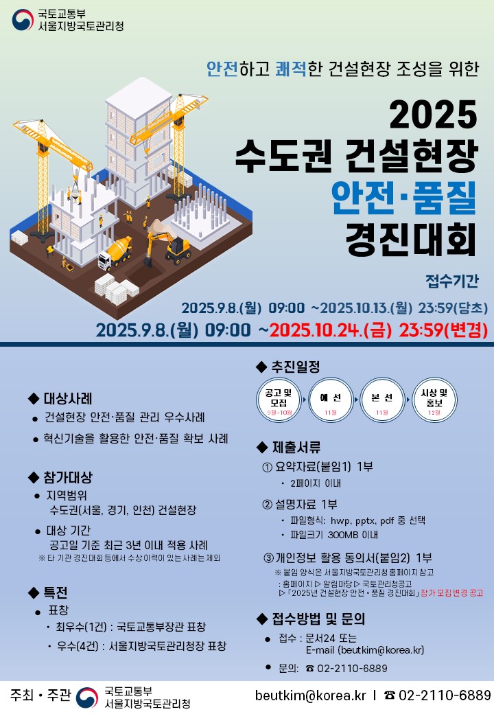 8068 | 2025년 수도권 건설현장 안전·품질 경진대회 참가 모집 변경 공고 ![]() |